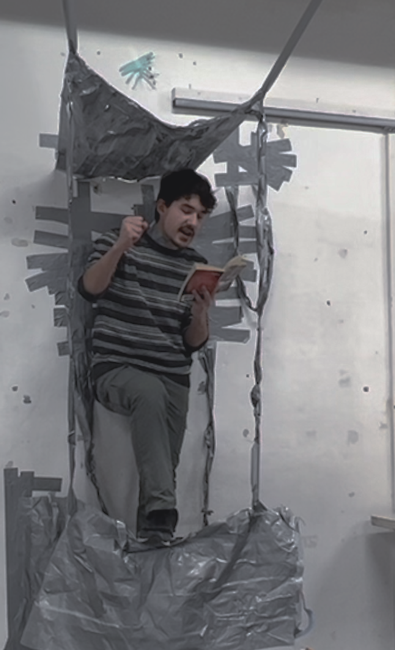 It is a series of tries to stick myself on a wooden wall, only using duct tape. There was no science or research behind it. Just seeing how long I could stick in different ways. It also reminded me of playing as a child. More so because it had some sort of goal.